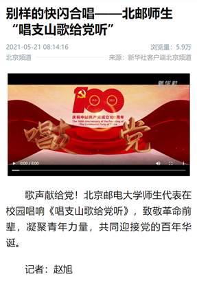 《唱支山歌给党听》的快闪视频中不仅展示了北邮师生的精神风貌,还体现了学校的发展成就,视频发布后在全校师生和校友中引发了热烈反响,受到了新华社和V思想(北京市教工委)等多家权威媒体的广泛关注和转发报道,截至目前,视频全网播放量已突破60万,并在发布时登上哔哩哔哩网站热门视频第一。