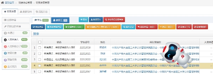 发展(zhan)党(dang)(dang)员(yuan)(yuan)(yuan)管(guan)理服务模块实(shi)现了“入党(dang)(dang)申请人(ren)——积极分子(zi)——发展(zhan)对(dui)象(xiang)——预备(bei)党(dang)(dang)员(yuan)(yuan)(yuan)——正式党(dang)(dang)员(yuan)(yuan)(yuan)”全(quan)过程、全(quan)周(zhou)期(qi)的动态分类(lei)管(guan)理服务和(he)(he)电子(zi)存档。党(dang)(dang)员(yuan)(yuan)(yuan)师生可随时查(cha)阅入党(dang)(dang)成熟度等(deng)信息。党(dang)(dang)务工作者更方便准确地了解(jie)各类(lei)成熟数(shu)量,有(you)助于科学(xue)制(zhi)定党(dang)(dang)员(yuan)(yuan)(yuan)发展(zhan)计划,分析解(jie)决发展(zhan)党(dang)(dang)员(yuan)(yuan)(yuan)工作的问(wen)题,提升了发展(zhan)党(dang)(dang)员(yuan)(yuan)(yuan)的质(zhi)量,有(you)助于提高发展(zhan)党(dang)(dang)员(yuan)(yuan)(yuan)工作的针(zhen)对(dui)性(xing)和(he)(he)有(you)效性(xing)。