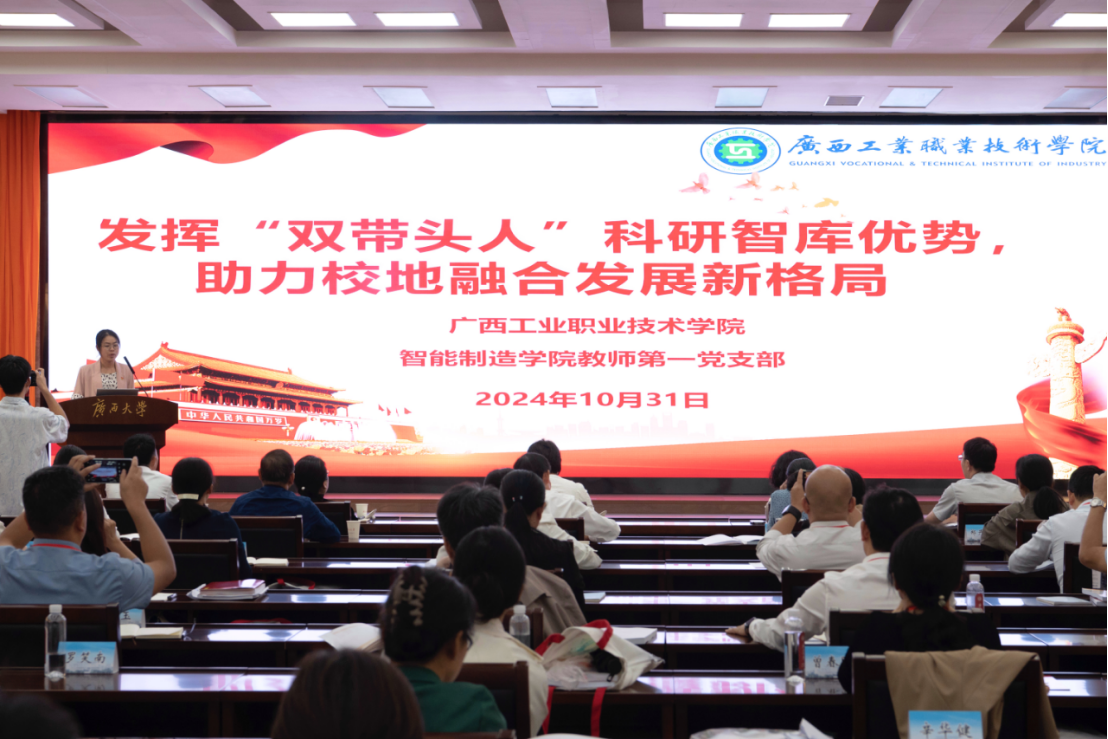 广西工业职业技术(shu)学院智(zhi)能制造学院教师第(di)一党支部围绕“发挥‘双带(dai)头(tou)人(ren)’科研智(zhi)库优(you)势,推动(dong)校(xiao)地融合(he)发展新格局”主题作(zuo)经(jing)验分享。