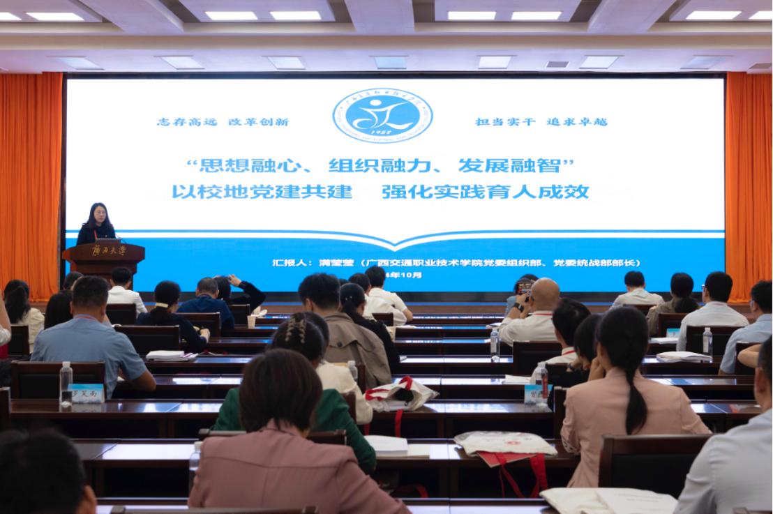 广西交(jiao)通职业技术(shu)学院围(wei)绕(rao)“思想(xiang)融心,组织融力,发展融智”以(yi)校地共建推动实践育人为主题作经验分享。