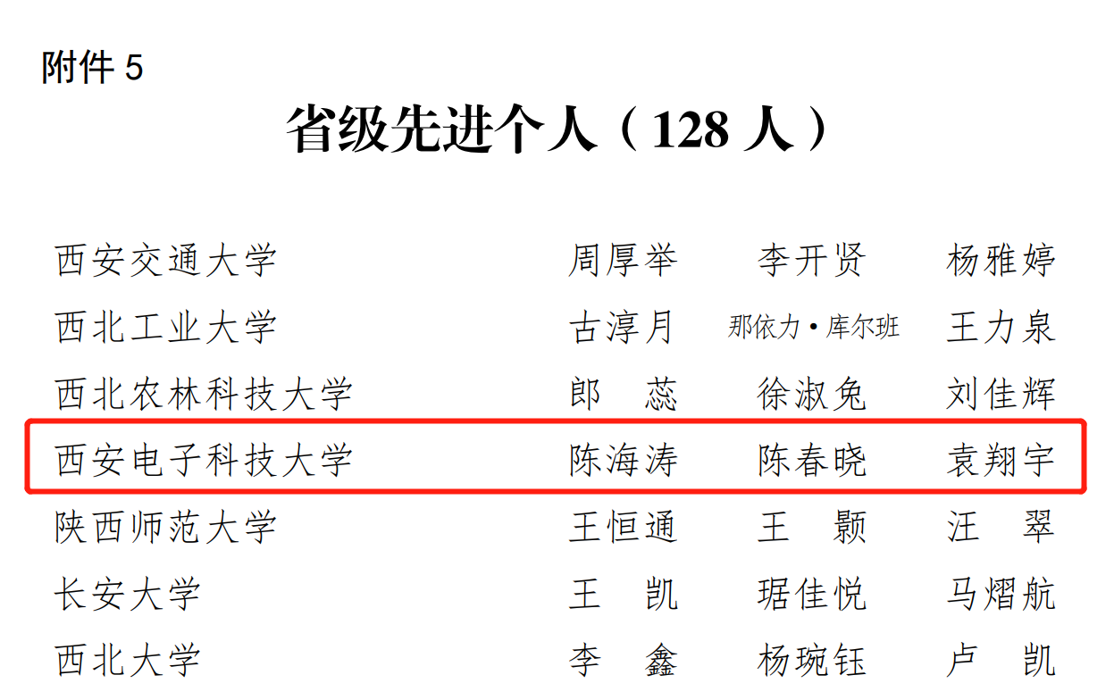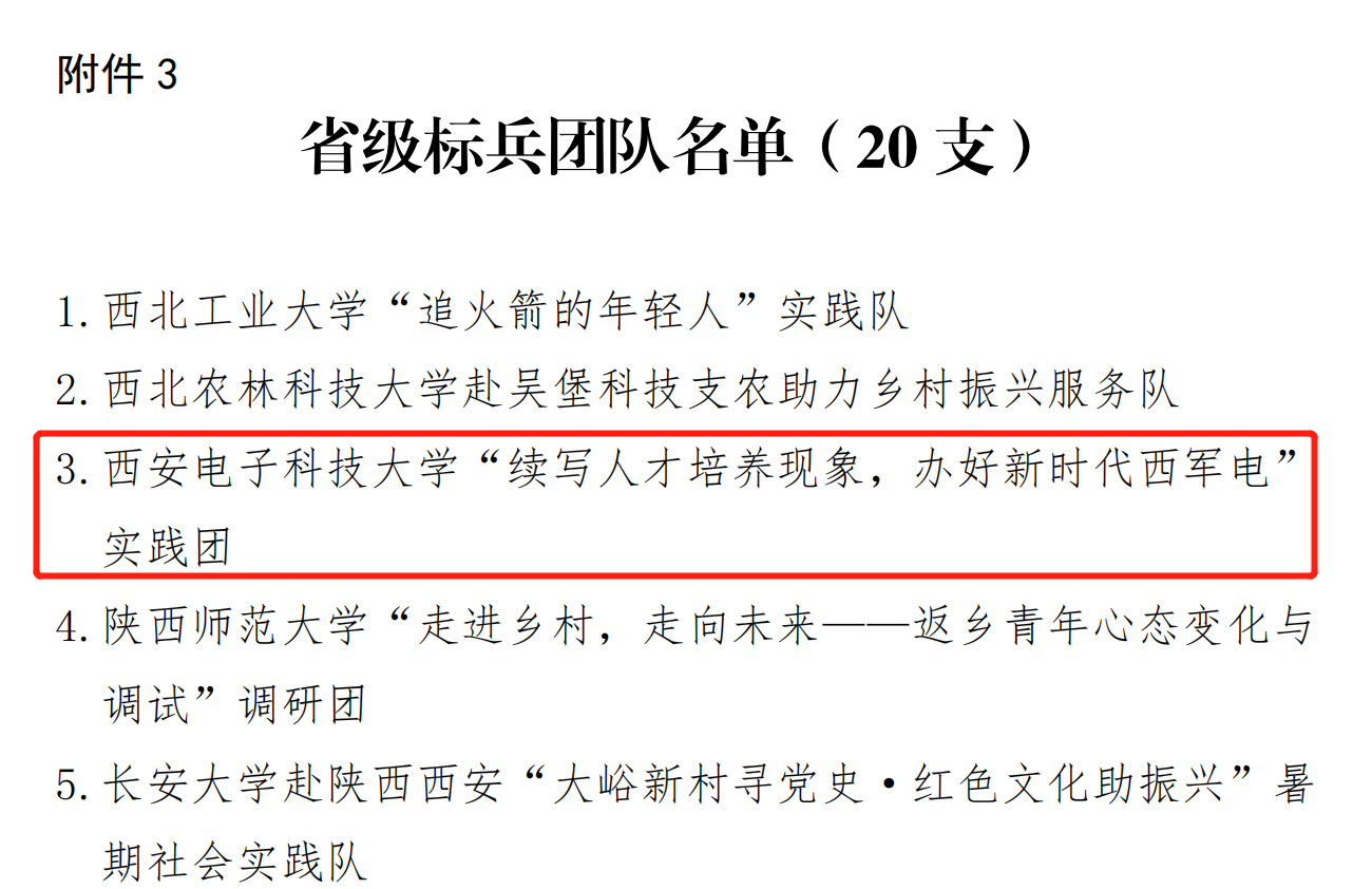 此外,中共陕西省委宣传部、中共陕西省委文明办、中共陕西省委教育工委等部门发布《关于2022年陕西省大中专学生志愿者暑期文化科技卫生“三下乡”社会实践活动先进集体、先进个人的通报》。西安电子科技大学获评“省级示范学校”(全省18个),“续写人才培养现象,办好新时代西军电”实践团获评“省级标兵团队”(全省20支),“赓续西电红色基因,重走总书记初心之路”专项实践队、“剧说风华”专项实践团获评“省级优秀团队”(全省111支),光电工程学院团委书记陈海涛、人文学院团委书记陈春晓、校团委学生兼职副书记袁翔宇获评“省级先进个人”(全省128人)。