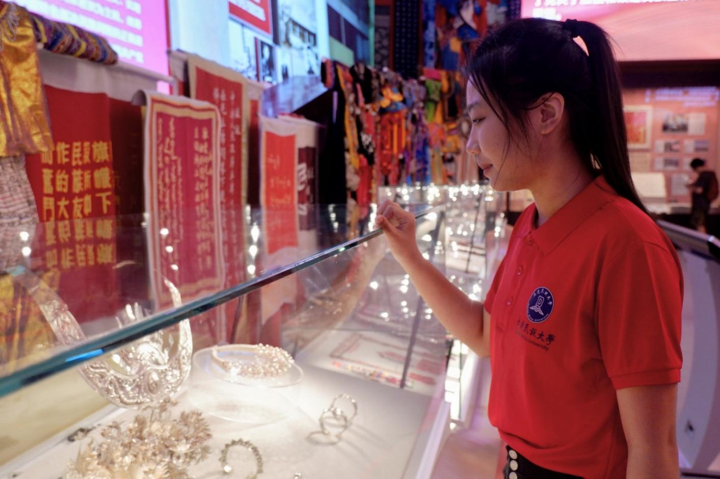“看到两位维吾尔(er)族(zu)姐妹亲手绣出的(de)十字绣里飘扬着(zhe)五星红旗,我(wo)的(de)心情久久不(bu)能平静。我(wo)坚信(xin)全国各族(zu)人民(min)(min)(min)心往一(yi)(yi)处(chu)想,劲往一(yi)(yi)处(chu)使(shi),祖(zu)国一(yi)(yi)定可以走向新的(de)辉煌!”新疆(jiang)维吾尔(er)自治区的(de)梁悦同(tong)学(xue)感(gan)叹道。学(xue)校组织专(zhuan)项团(tuan)队(dui)赴民(min)(min)(min)族(zu)文(wen)化(hua)宫参(can)观铸牢中华(hua)民(min)(min)(min)族(zu)共(gong)同(tong)体意识文(wen)物古籍展,民(min)(min)(min)大(da)学(xue)子(zi)翻阅藏在花瓣中的(de)珍贵古籍,聆听(ting)民(min)(min)(min)乐交响,探寻(xun)波澜壮阔的(de)中华(hua)民(min)(min)(min)族(zu)发(fa)展历史,亲身体验博大(da)精深的(de)中华(hua)优秀传统文(wen)化(hua),深刻(ke)感(gan)悟(wu)中国共(gong)产(chan)党百年民(min)(min)(min)族(zu)工作(zuo)伟(wei)大(da)成就。