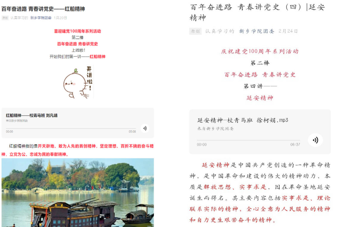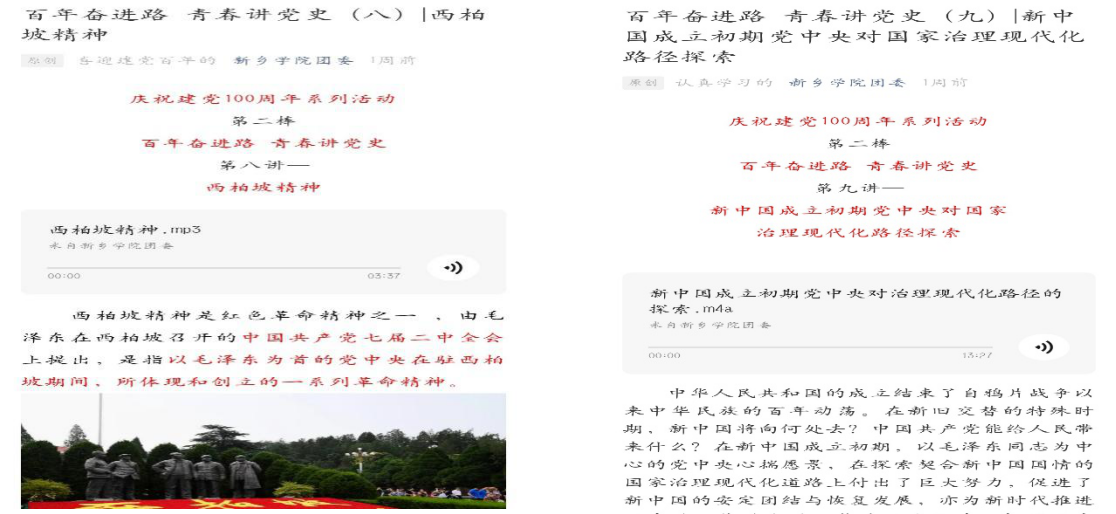 青(qing)年(nian)宣讲(jiang)作为新乡学(xue)院共青(qing)团(tuan)庆(qing)祝建党100周(zhou)年(nian)的(de)系列活(huo)动之一(yi),青(qing)马班于今年(nian)年(nian)初率先开展了以“百年(nian)奋(fen)进路 青(qing)春讲(jiang)党史”为主(zhu)题的(de)线上(shang)宣讲(jiang)。在精(jing)心策划下,学(xue)员们共分为13组(zu),已完成9期推送(song)。
