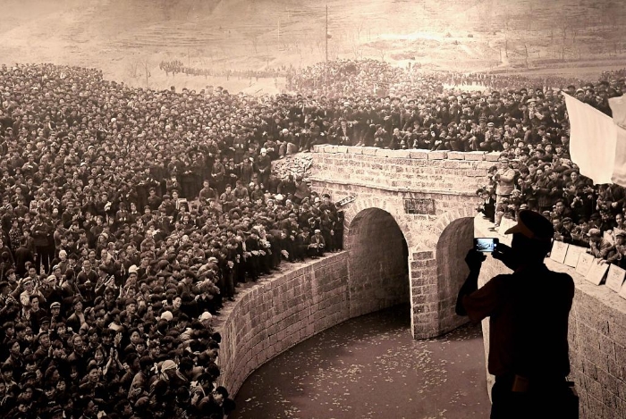 参观者(zhe)在红旗渠(qu)(qu)纪念馆拍摄展出(chu)的红旗渠(qu)(qu)通水庆典照(zhao)片(2019年7月4日摄)。新华社记者(zhe) 李安(an) 摄