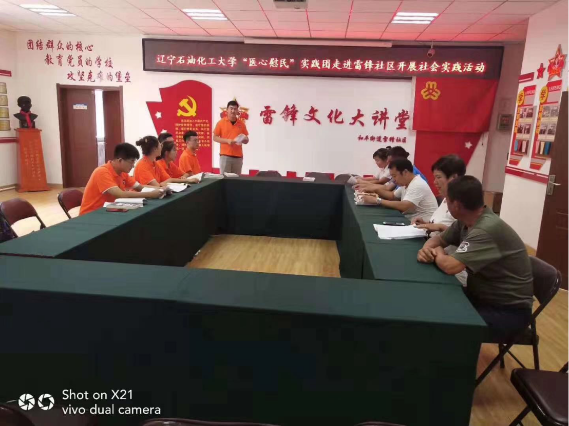 为充分学(xue)习贯彻党的(de)(de)(de)十九大(da)(da)(da)提(ti)出的(de)(de)(de)“健(jian)(jian)康中(zhong)国(guo)战(zhan)略”——向(xiang)人民(min)(min)(min)群众(zhong)提(ti)供(gong)全(quan)(quan)方位全(quan)(quan)周期健(jian)(jian)康服务的(de)(de)(de)新(xin)(xin)任务和(he)新(xin)(xin)要求;积极响(xiang)应习近平总书记在(zai)全(quan)(quan)国(guo)卫生(sheng)与健(jian)(jian)康大(da)(da)(da)会上发表的(de)(de)(de)重(zhong)要讲(jiang)话精(jing)神,即(ji)“要把人民(min)(min)(min)健(jian)(jian)康放(fang)在(zai)优先发展的(de)(de)(de)战(zhan)略地(di)位”。辽宁石油化(hua)工大(da)(da)(da)学(xue)“医心慰民(min)(min)(min)”暑期社(she)(she)会实(shi)践(jian)团在(zai)“健(jian)(jian)康中(zhong)国(guo)"建设战(zhan)略背景下(xia),于2019年8月(yue)19日至(zhi)8月(yue)22日分别(bie)走入(ru)抚(fu)(fu)顺市(shi)(shi)望花区雷(lei)(lei)锋社(she)(she)区、抚(fu)(fu)顺市(shi)(shi)新(xin)(xin)抚(fu)(fu)区千(qian)金(jin)乡政(zheng)府、抚(fu)(fu)顺市(shi)(shi)新(xin)(xin)抚(fu)(fu)区千(qian)金(jin)乡卫生(sheng)院、抚(fu)(fu)顺市(shi)(shi)新(xin)(xin)抚(fu)(fu)区千(qian)金(jin)乡千(qian)金(jin)村,开(kai)展大(da)(da)(da)学(xue)生(sheng)社(she)(she)会实(shi)践(jian)活动,以满足人民(min)(min)(min)群众(zhong)的(de)(de)(de)健(jian)(jian)康服务需求。辽宁抚(fu)(fu)顺是雷(lei)(lei)锋同志的(de)(de)(de)第二(er)故乡,如今雷(lei)(lei)锋精(jing)神薪火相传。