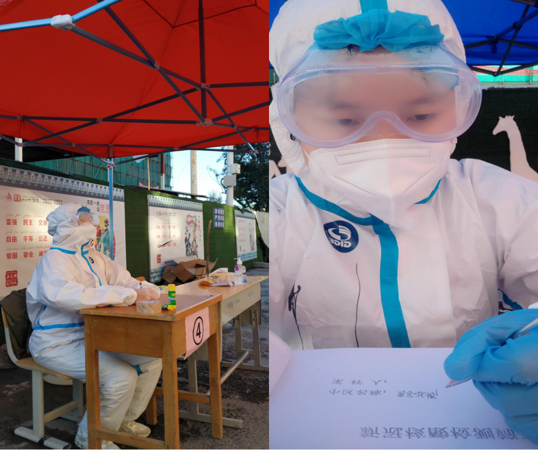 自7月起,新(xin)(xin)疆(jiang)乌鲁木(mu)齐突发新(xin)(xin)冠肺炎疫情,疫情来(lai)势凶(xiong)猛,新(xin)(xin)疆(jiang)再次按下(xia)暂停键(jian)。家(jia)在(zai)(zai)乌鲁木(mu)齐的(de)实(shi)(shi)践(jian)(jian)队员杨(yang)玉敏同(tong)学和家(jia)在(zai)(zai)塔城(cheng)的(de)实(shi)(shi)践(jian)(jian)队员唐章(zhang)翼同(tong)学第一时(shi)间(jian)向(xiang)社区申(shen)请成为(wei)(wei)一名防疫志愿(yuan)者,参与到(dao)家(jia)乡防疫抗疫一线工(gong)作(zuo)(zuo)中(zhong),为(wei)(wei)做(zuo)好(hao)疫情防控(kong)工(gong)作(zuo)(zuo)献出自己的(de)一份(fen)力量。在(zai)(zai)担(dan)任志愿(yuan)者期(qi)间(jian),他们每天(tian)要处理很多繁杂的(de)工(gong)作(zuo)(zuo),每日登计居(ju)(ju)民(min)体温数据(ju)、统计居(ju)(ju)民(min)所(suo)需用品(pin)、为(wei)(wei)居(ju)(ju)民(min)配送生活物资、收(shou)拾清理楼(lou)(lou)座卫生、对楼(lou)(lou)道进行消毒工(gong)作(zuo)(zuo)、小区卡点(dian)执勤、社区辖区巡逻.....这些都是他们的(de)工(gong)作(zuo)(zuo)的(de)常态,一次次的(de)登记信(xin)息,一趟趟的(de)往返都只为(wei)(wei)保障居(ju)(ju)民(min)生活需求做(zuo)出了巨大的(de)贡(gong)献。