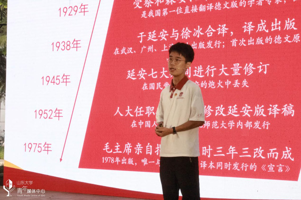 为(wei)把(ba)“四史(shi)(shi)(shi)(shi)”学习转化为(wei)育(yu)人(ren)成效,将党(dang)史(shi)(shi)(shi)(shi)知识融(rong)入青(qing)(qing)(qing) 年(nian)(nian)团(tuan)员教育(yu)日常,引导(dao)青(qing)(qing)(qing)年(nian)(nian)学生(sheng)知史(shi)(shi)(shi)(shi)爱党(dang)、知史(shi)(shi)(shi)(shi)爱国(guo)(guo),以昂扬(yang)青(qing)(qing)(qing)年(nian)(nian)奋斗者(zhe)姿(zi)态迎(ying)接全面建(jian)设社会(hui)主义现代化国(guo)(guo)家新征程(cheng),由校团(tuan)委主办、经济学院(yuan)团(tuan)委承办,组建(jian)山东大学党(dang)史(shi)(shi)(shi)(shi)学习教育(yu)“青(qing)(qing)(qing)年(nian)(nian)宣(xuan)讲团(tuan)”并开(kai)展(zhan)“百(bai)天百(bai)队(dui)百(bai)场讲百(bai)年(nian)(nian)党(dang)史(shi)(shi)(shi)(shi)”宣(xuan)讲活(huo)动(dong),成立青(qing)(qing)(qing)年(nian)(nian)菁英宣(xuan)讲团(tuan)、青(qing)(qing)(qing)年(nian)(nian)志愿者(zhe)宣(xuan)讲团(tuan)、青(qing)(qing)(qing)年(nian)(nian)“轻骑(qi)兵(bing)”宣(xuan)讲团(tuan),并与(yu)教师工(gong)作(zuo)部共(gong)同(tong)成立青(qing)(qing)(qing)年(nian)(nian)教师宣(xuan)讲团(tuan),涵盖青(qing)(qing)(qing)年(nian)(nian)教师、硕(shuo)博研(yan)究(jiu)生(sheng)、各志愿服务团(tuan)队(dui)、团(tuan)校学员、各学生(sheng)组织及学生(sheng)理论社团(tuan)等多个(ge)“轻骑(qi)兵(bing)”团(tuan)队(dui),面向全校团(tuan)员青(qing)(qing)(qing)年(nian)(nian)开(kai)展(zhan)宣(xuan)讲活(huo)动(dong)。