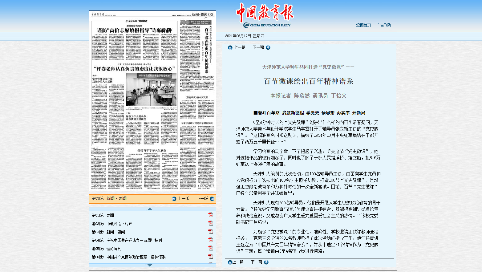 为进一(yi)步在大学(xue)生(sheng)中(zhong)(zhong)加强(qiang)(qiang)“三爱”“四史”教育,引导(dao)学(xue)生(sheng)学(xue)好(hao)悟通党(dang)(dang)(dang)在百(bai)年奋斗中(zhong)(zhong)的光辉(hui)历史、初心宗旨、伟大贡献(xian)、伟大精神和宝贵经验,天(tian)津师范大学(xue)党(dang)(dang)(dang)委学(xue)生(sheng)工作部组(zu)织开(kai)展了(le)“百(bai)名党(dang)(dang)(dang)员颂英烈 砥(di)砺奋进新(xin)征(zheng)程(cheng)”“今(jin)(jin)(jin)天(tian)是‘我(wo)们(men)’的生(sheng)日——我(wo)把历史上的今(jin)(jin)(jin)天(tian)讲(jiang)给(ji)你(ni)听”党(dang)(dang)(dang)史故事宣讲(jiang)活(huo)动。150名学(xue)生(sheng)党(dang)(dang)(dang)员骨干选取(qu)了(le)150位革命烈士的感人事迹,自(zi)(zi)庆祝建(jian)党(dang)(dang)(dang)百(bai)年华诞倒计时100天(tian)之日起,100名当天(tian)过生(sheng)日的学(xue)生(sheng)以自(zi)(zi)己(ji)的视角(jiao)分享(xiang)、讲(jiang)述历史上的今(jin)(jin)(jin)天(tian)。他(ta)们(men)走进党(dang)(dang)(dang)团支部、走进社(she)区、走进中(zhong)(zhong)小学(xue)校(xiao)开(kai)展了(le)近300场宣讲(jiang),同时录制成线(xian)上微课(ke)、H5,以“强(qiang)(qiang)国(guo)一(yi)代”之声讲(jiang)述红色故事,传承红色基因,并汇编成《今(jin)(jin)(jin)天(tian)是‘我(wo)们(men)’的生(sheng)日》电(dian)子书。
