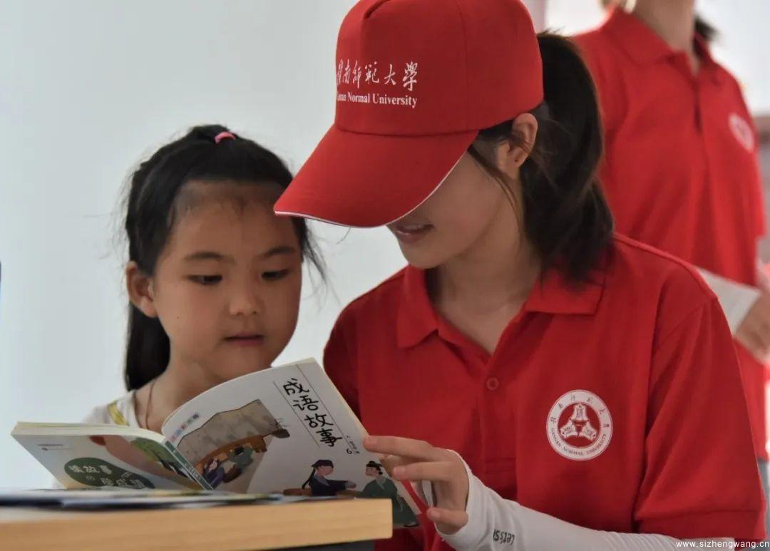 志愿者(zhe)们与小朋(peng)友在书角一起遨游在书籍的海(hai)洋