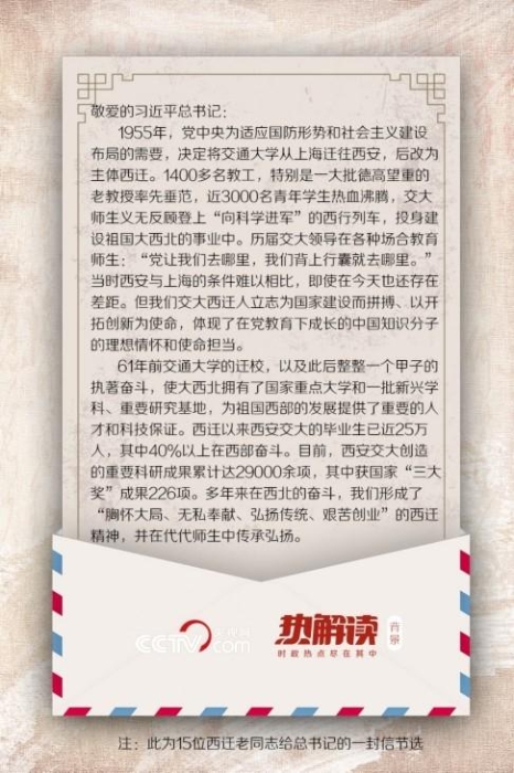 会见中(zhong),习(xi)近平谈起教授们两年多前写给他的一(yi)封信。这封信讲述了(le)一(yi)大批师(shi)生教工“甘洒青(qing)春为家国”的感人故事。