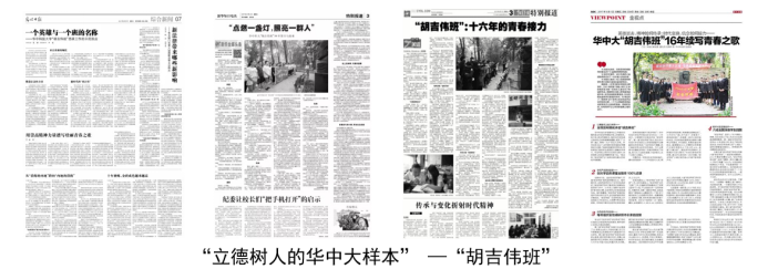 在“胡吉伟班”,躬耕实践激情盎然。“经世济民”的使命号召着“胡吉伟班”学子深入社会开展实践调研和志愿服务。“胡吉伟班”连续12年开展爱心家教,关注农民工子女;第一届“胡吉伟班”同学在毕业10年返校之际,设立了胡吉伟奖助金;第三届“胡吉伟班”发起“情系灾区、义援郧西”爱心义卖活动;第四届“胡吉伟班”同学赴湘鄂闽调研少数民族地区精准扶贫问题,获得省优秀社会实践队荣誉。第五届“胡吉伟班”在四川雅安地震后发起募捐活动,长期定向资助受灾家庭学生。第六届“胡吉伟班”牵头的“心援队”坚持定期看望空巢老人,获得省优秀志愿服务组织称号。第七届“胡吉伟班”与随县国家电网“光满·爱心红丝带”党员先锋队结对,为当地脱贫攻坚贡献专业力量。