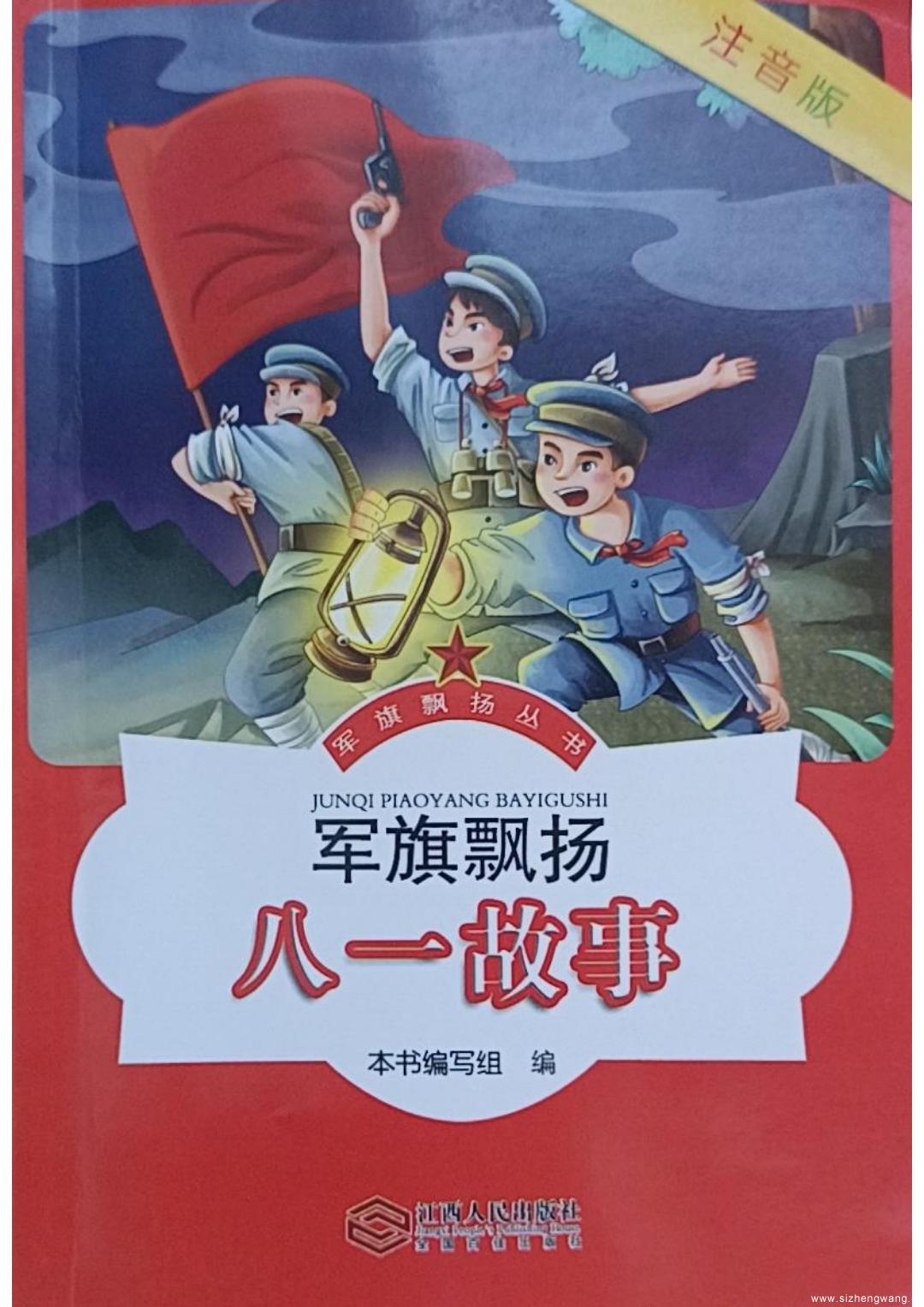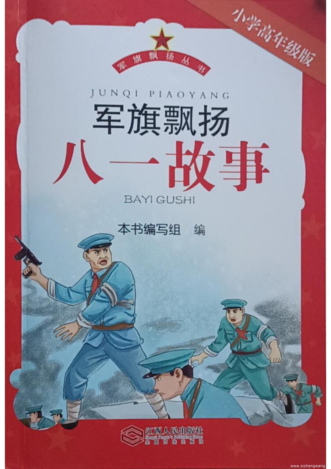 为隆重纪(ji)念南昌起义90周年,庆祝中(zhong)国(guo)人民解(jie)放军(jun)(jun)90周年,弘(hong)扬(yang)八(ba)一精(jing)(jing)(jing)神,推进红(hong)色文化进校园,传承红(hong)色基因(yin),江西人民出版社(she)协同(tong)江西科技师范(fan)大学八(ba)一精(jing)(jing)(jing)神研究中(zhong)心出版了《军(jun)(jun)旗(qi)(qi)飘(piao)(piao)扬(yang)》套书,包括《军(jun)(jun)旗(qi)(qi)飘(piao)(piao)扬(yang)·八(ba)一精(jing)(jing)(jing)神》(注音版),《军(jun)(jun)旗(qi)(qi)飘(piao)(piao)扬(yang)·八(ba)一精(jing)(jing)(jing)神》(小学高(gao)年级版),《军(jun)(jun)旗(qi)(qi)飘(piao)(piao)扬(yang)·八(ba)一精(jing)(jing)(jing)神》(中(zhong)学版),《军(jun)(jun)旗(qi)(qi)飘(piao)(piao)扬(yang)·八(ba)一精(jing)(jing)(jing)神》(高(gao)中(zhong)版)。