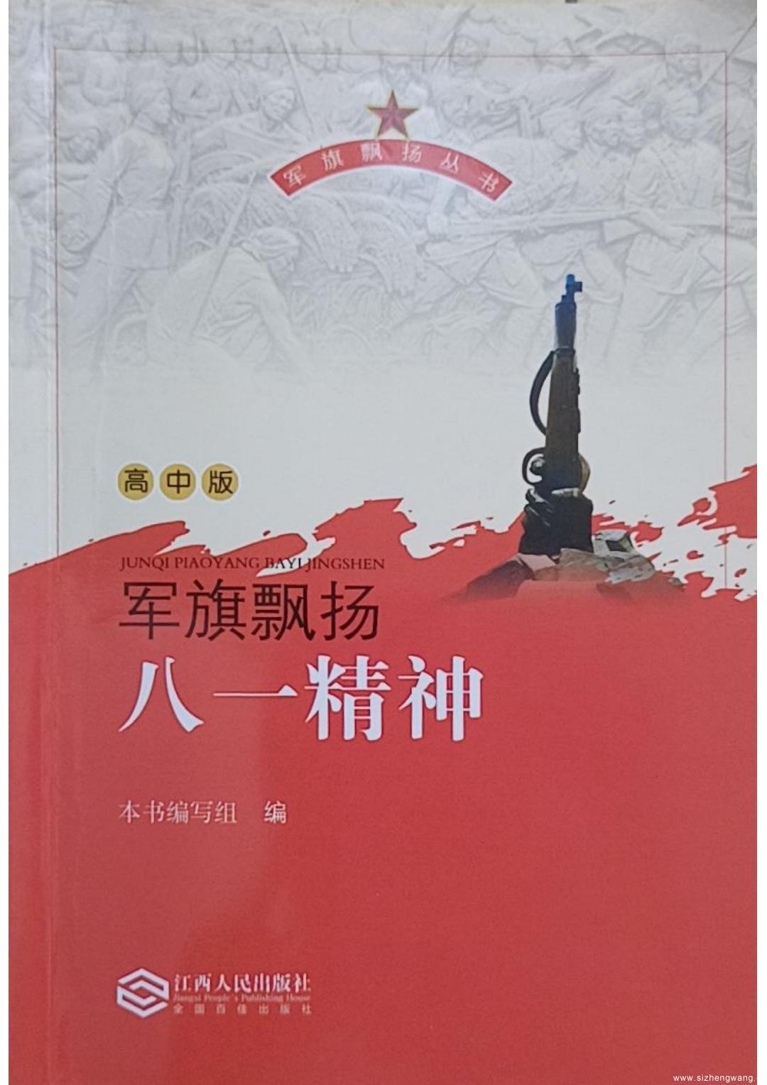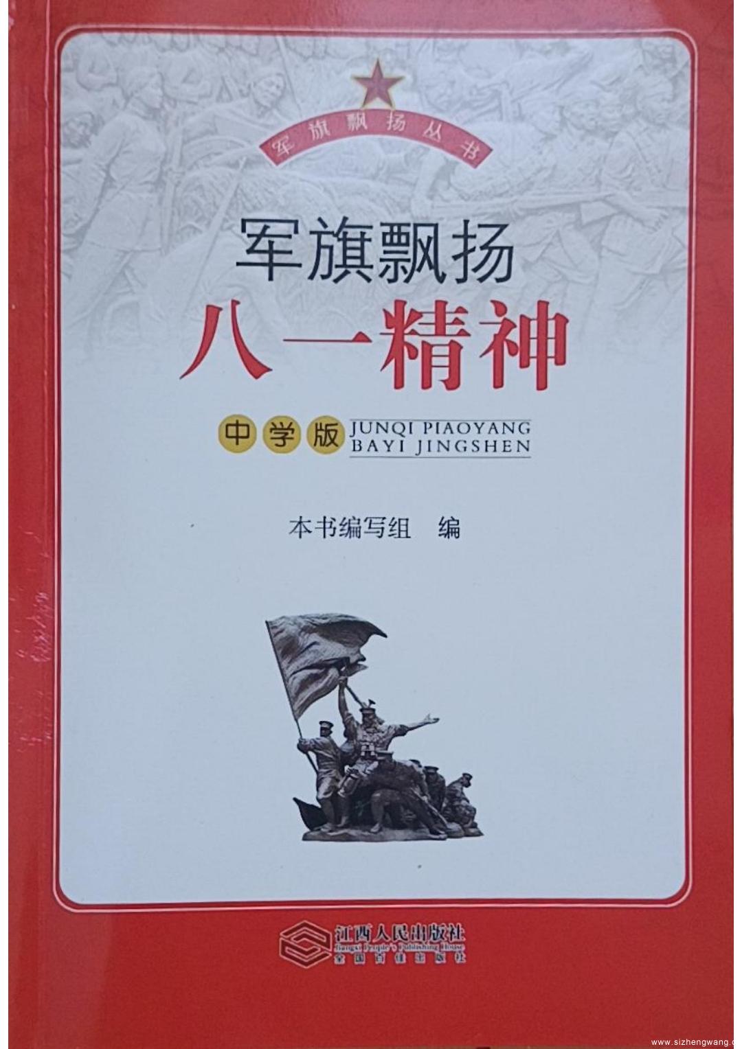 为隆重纪念南昌起义90周年,庆(qing)祝中(zhong)(zhong)国人民解放军(jun)(jun)90周年,弘扬(yang)八(ba)一(yi)精神,推进(jin)红色(se)(se)文(wen)化进(jin)校园,传承红色(se)(se)基因,江(jiang)西(xi)人民出版社协(xie)同江(jiang)西(xi)科技(ji)师范大学(xue)八(ba)一(yi)精神研究中(zhong)(zhong)心出版了《军(jun)(jun)旗飘(piao)扬(yang)》套书(shu),包括《军(jun)(jun)旗飘(piao)扬(yang)·八(ba)一(yi)精神》(注音版),《军(jun)(jun)旗飘(piao)扬(yang)·八(ba)一(yi)精神》(小学(xue)高年级版),《军(jun)(jun)旗飘(piao)扬(yang)·八(ba)一(yi)精神》(中(zhong)(zhong)学(xue)版),《军(jun)(jun)旗飘(piao)扬(yang)·八(ba)一(yi)精神》(高中(zhong)(zhong)版)。
