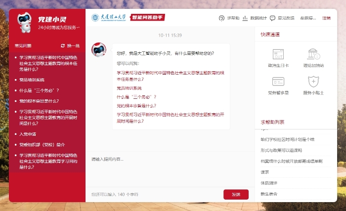 智(zhi)能(neng)服(fu)务(wu)助手“党(dang)建(jian)小灵(ling)”面(mian)向(xiang)全校基(ji)层党(dang)务(wu)工作者和全体师生(sheng)党(dang)员提(ti)供了(le)“政治生(sheng)日贺(he)卡、理(li)论加油站(zhan)、党(dang)务(wu)智(zhi)多星、服(fu)务(wu)小贴士”四个方面(mian)的指(zhi)导服(fu)务(wu),在党(dang)员理(li)论学习、基(ji)层党(dang)务(wu)办理(li)等方面(mian)实现人机互(hu)动,提(ti)升(sheng)了(le)基(ji)层党(dang)建(jian)服(fu)务(wu)效(xiao)能(neng)。
