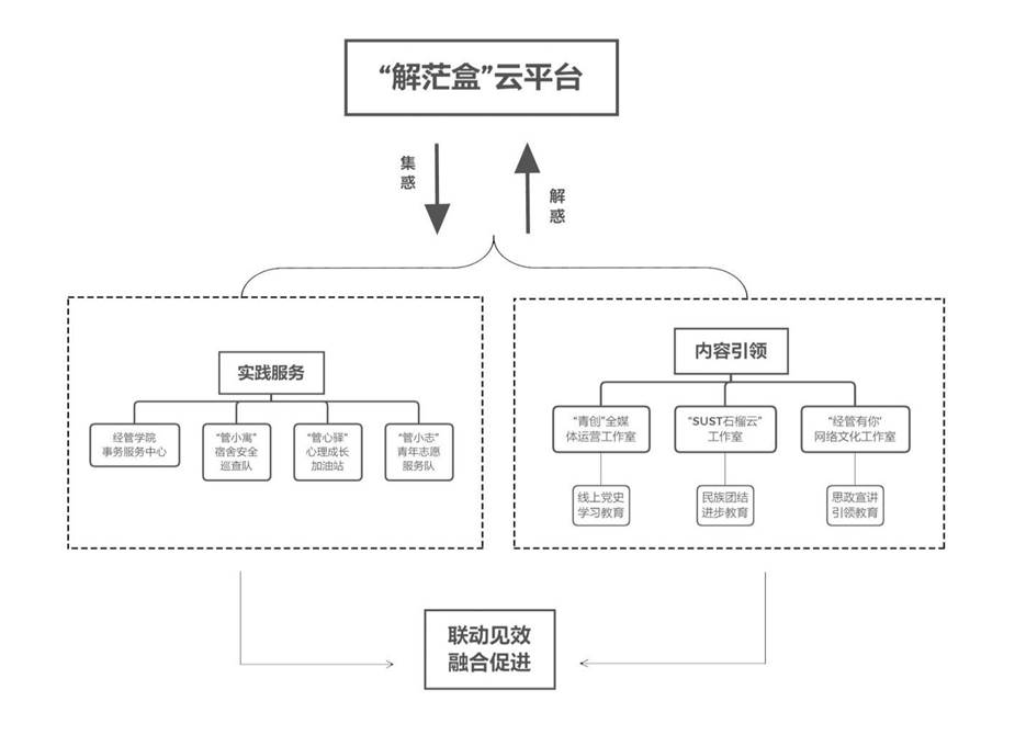 本案例(li)以“解(jie)茫盒(he)”云平台(tai)为(wei)载(zai)体(ti),秉承“全(quan)心(xin)全(quan)意为(wei)学生服(fu)务”的初心(xin),以“知需,听思(si),答疑(yi),解(jie)惑(huo)”为(wei)服(fu)务理念,以“线上集惑(huo)——线下(xia)解(jie)惑(huo)——联动(dong)见效”为(wei)设计思(si)路(lu),搭建了一(yi)个线上“解(jie)茫盒(he)”云平台(tai),建立了四支线下(xia)实(shi)践(jian)服(fu)务团队(dui)、打造了三个支撑和丰富云平台(tai)内容(rong)输出(chu)的网(wang)络文化工作(zuo)室,以此(ci)来实(shi)现对(dui)青年学生的集惑(huo)与解(jie)惑(huo),从而打通高(gao)校进行思(si)想政(zheng)治教(jiao)育“最(zui)后(hou)一(yi)公里(li)”的实(shi)践(jian)创(chuang)新路(lu)径,大力推(tui)动(dong)思(si)政(zheng)育人(ren)的高(gao)度、深度与广度。