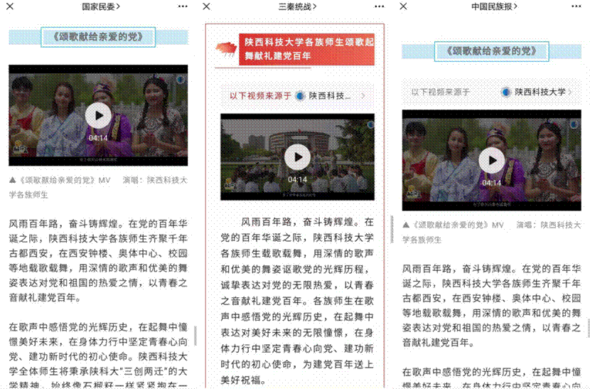 “SUST石榴云”工作(zuo)室通(tong)过各(ge)类线下活动与(yu)线上宣传进(jin)(jin)(jin)行民(min)族(zu)团(tuan)结进(jin)(jin)(jin)步教育。2021年恰逢建(jian)(jian)党百(bai)年,工作(zuo)室将“建(jian)(jian)党百(bai)年”与(yu)“民(min)族(zu)团(tuan)结进(jin)(jin)(jin)步教育”有机结合,创作(zuo)视频(pin)作(zuo)品《颂歌献给亲爱的党》庆祝(zhu)建(jian)(jian)党百(bai)年,祝(zhu)伟(wei)大的祖国(guo)生日快(kuai)乐。视频(pin)一经发布在(zai)网上广(guang)泛传播(bo),并受到国(guo)家民(min)委(wei)、三秦(qin)统战(zhan)、中国(guo)民(min)族(zu)报等多(duo)家官方媒体的转载报道。