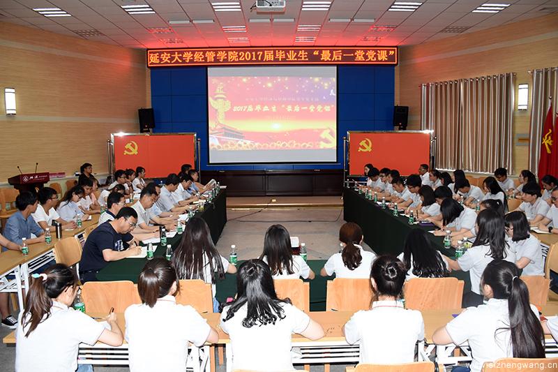 “即将启程(cheng)去另(ling)一片天地,这一课是母校(xiao)给予我(wo)们毕业(ye)(ye)生(sheng)(sheng)党(dang)(dang)(dang)(dang)员(yuan)的(de)珍贵(gui)礼物,在此聆(ling)听真情嘱托,谆(zhun)谆(zhun)教(jiao)诲,完成一名党(dang)(dang)(dang)(dang)员(yuan)又一次的(de)蜕变。”毕业(ye)(ye)生(sheng)(sheng)党(dang)(dang)(dang)(dang)员(yuan)马颂(song)浩(hao)如是说。6月(yue)22日(ri)下午,经管学(xue)院(yuan)2017“毕业(ye)(ye)生(sheng)(sheng)最后一堂党(dang)(dang)(dang)(dang)课”主(zhu)题党(dang)(dang)(dang)(dang)日(ri)活(huo)(huo)动(dong)(dong)在路遥报告(gao)厅举行。延安(an)大学(xue)党(dang)(dang)(dang)(dang)委(wei)书(shu)记薛义忠参加活(huo)(huo)动(dong)(dong)并(bing)为毕业(ye)(ye)生(sheng)(sheng)党(dang)(dang)(dang)(dang)员(yuan)讲了(le)党(dang)(dang)(dang)(dang)课。校(xiao)党(dang)(dang)(dang)(dang)委(wei)副书(shu)记田伏(fu)虎,党(dang)(dang)(dang)(dang)委(wei)委(wei)员(yuan)、组(zu)织部部长(zhang)(zhang)(zhang)(zhang)姚(yao)正宽,党(dang)(dang)(dang)(dang)委(wei)委(wei)员(yuan)、宣(xuan)传部部长(zhang)(zhang)(zhang)(zhang)杜红(hong)荣,党(dang)(dang)(dang)(dang)委(wei)委(wei)员(yuan)、学(xue)工(gong)部部长(zhang)(zhang)(zhang)(zhang)高(gao)峰,团委(wei)书(shu)记李杨(yang),党(dang)(dang)(dang)(dang)委(wei)办公(gong)室(shi)、校(xiao)长(zhang)(zhang)(zhang)(zhang)办公(gong)室(shi)副主(zhu)任兰鸿(hong)涛,经管学(xue)院(yuan)院(yuan)长(zhang)(zhang)(zhang)(zhang)姬雄华、党(dang)(dang)(dang)(dang)委(wei)书(shu)记姜(jiang)庆,以及40名毕业(ye)(ye)生(sheng)(sheng)党(dang)(dang)(dang)(dang)员(yuan)和(he)10名学(xue)生(sheng)(sheng)党(dang)(dang)(dang)(dang)员(yuan)代表等参加了(le)党(dang)(dang)(dang)(dang)日(ri)活(huo)(huo)动(dong)(dong)。党(dang)(dang)(dang)(dang)日(ri)活(huo)(huo)动(dong)(dong)由(you)经管学(xue)院(yuan)学(xue)生(sheng)(sheng)第(di)三(san)党(dang)(dang)(dang)(dang)支部书(shu)记王欢主(zhu)持。
