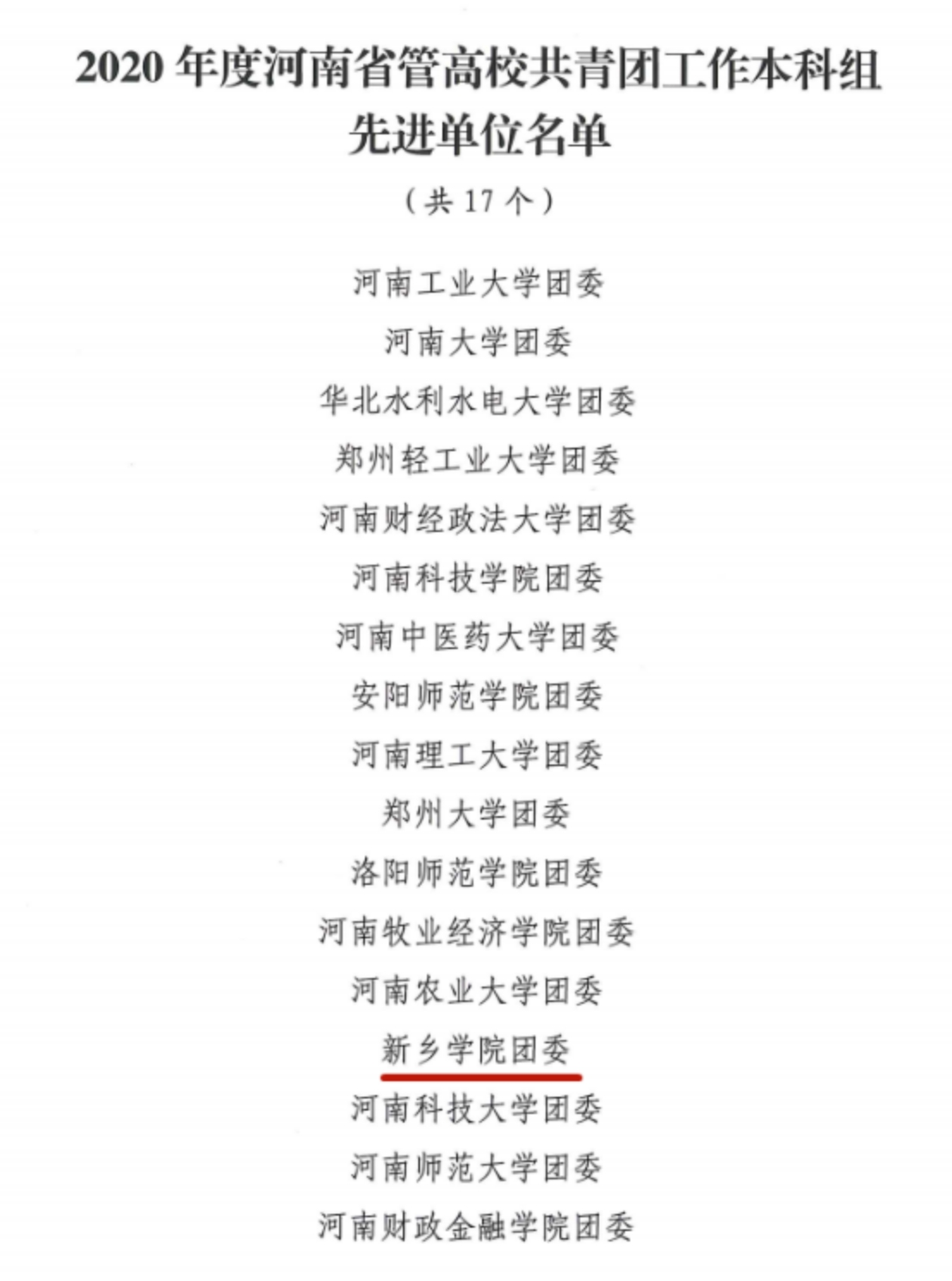 近日(ri),共(gong)青(qing)团河南省委公布了全省省管(guan)高校2020年(nian)度共(gong)青(qing)团工作综(zong)合(he)考(kao)评结果(guo),新乡学院(yuan)团委获评河南高校共(gong)青(qing)团工作先进单(dan)位。