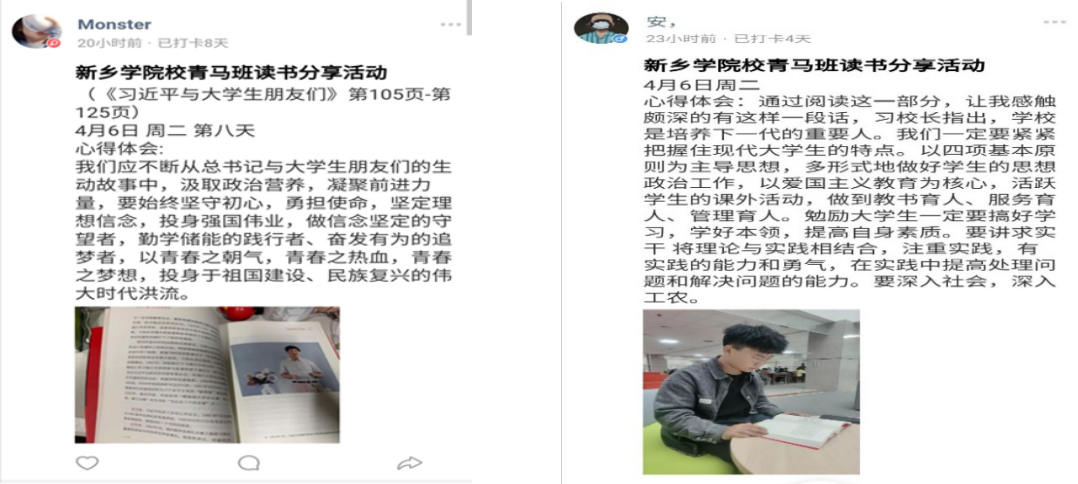 本期青马班开班以来(lai),学员们(men)坚持开展读(du)书(shu)打卡活动,结合今年(nian)建党(dang)(dang)100周(zhou)年(nian)的主(zhu)线以及(ji)“学党(dang)(dang)史 强信念 跟党(dang)(dang)走”学习教育的要求(qiu),选取了(le)《习近平(ping)与大学生朋友们(men)》《中华人(ren)民共和(he)国国史》《中国共产(chan)党(dang)(dang)简(jian)史》等为必读(du)书(shu)目。