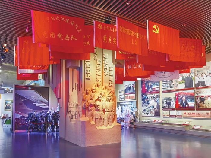 为纪(ji)念这场(chang)惊心动(dong)魄的(de)抗疫大战(zhan),中国共产党历(li)史展(zhan)览(lan)馆还(hai)原了医(yi)护(hu)人(ren)员逆行出征(zheng)、挽(wan)救生(sheng)命的(de)感人(ren)场(chang)景。在场(chang)景一(yi)侧的(de)展(zhan)柜中,陈列着一(yi)组实物(wu),其(qi)中包括一(yi)个印有“同饮长江水 共食(shi)咸宁鱼”字样的(de)塑料袋、几张2020年4月8日武汉解封(feng)当日的(de)机票和火车票,以及中国研发的(de)新冠疫苗。这一(yi)逼(bi)真(zhen)的(de)场(chang)景和这些看似普通的(de)物(wu)品,生(sheng)动(dong)展(zhan)现了生(sheng)命至上、举国同心、舍生(sheng)忘死、尊重科学、命运与(yu)共的(de)伟(wei)大抗疫精神。