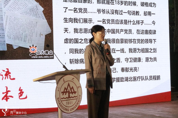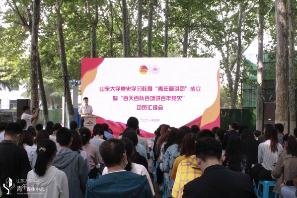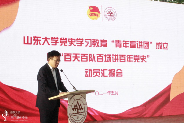 为认真(zhen)学(xue)习(xi)(xi)贯(guan)彻总书(shu)记在(zai)党(dang)(dang)史(shi)(shi)(shi)学(xue)习(xi)(xi)教育动(dong)员大会上的重要讲话精神,把(ba)“四(si)史(shi)(shi)(shi)”学(xue)习(xi)(xi)转化为育人成(cheng)效,将党(dang)(dang)史(shi)(shi)(shi)知(zhi)识融入青(qing)(qing)年(nian)团员教育日(ri)常,引导青(qing)(qing)年(nian)学(xue)生知(zhi)史(shi)(shi)(shi)爱党(dang)(dang)、知(zhi)史(shi)(shi)(shi)爱国,5月13日(ri),山(shan)(shan)东(dong)大学(xue)党(dang)(dang)史(shi)(shi)(shi)学(xue)习(xi)(xi)教育“青(qing)(qing)年(nian)宣讲团”成(cheng)立暨(ji)“百(bai)(bai)天百(bai)(bai)队百(bai)(bai)场讲百(bai)(bai)年(nian)党(dang)(dang)史(shi)(shi)(shi)”动(dong)员汇(hui)报(bao)会在(zai)中心校区小树林举行。山(shan)(shan)东(dong)大学(xue)党(dang)(dang)委(wei)副书(shu)记王(wang)君松,山(shan)(shan)东(dong)大学(xue)党(dang)(dang)委(wei)常委(wei)、宣传部(bu)(教工(gong)部(bu))部(bu)长桑晓(xiao)旻(min)出席会议。会议由山(shan)(shan)东(dong)省(sheng)青(qing)(qing)年(nian)志愿(yuan)服务(wu)先进个人、山(shan)(shan)东(dong)大学(xue)十佳共青(qing)(qing)团员马文啸主持,山(shan)(shan)大青(qing)(qing)年(nian)师生代表参与(yu)活动(dong)。