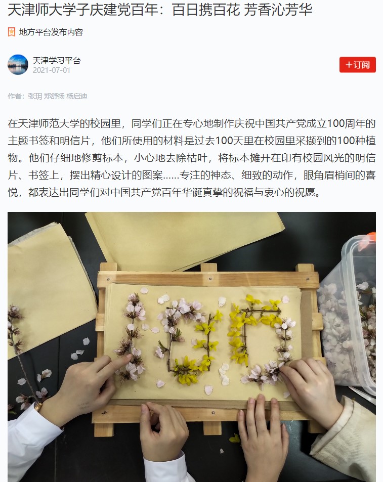 为进一(yi)步在大学(xue)生(sheng)中(zhong)(zhong)加强(qiang)(qiang)“三爱”“四史”教育,引导(dao)学(xue)生(sheng)学(xue)好(hao)悟通党(dang)(dang)(dang)在百(bai)年奋斗中(zhong)(zhong)的光辉(hui)历史、初心宗旨、伟大贡献(xian)、伟大精神和宝贵经验,天(tian)津师范大学(xue)党(dang)(dang)(dang)委学(xue)生(sheng)工作部组(zu)织开(kai)展了(le)“百(bai)名党(dang)(dang)(dang)员颂英烈 砥(di)砺奋进新(xin)征(zheng)程(cheng)”“今(jin)(jin)(jin)天(tian)是‘我(wo)们(men)’的生(sheng)日——我(wo)把历史上的今(jin)(jin)(jin)天(tian)讲(jiang)给(ji)你(ni)听”党(dang)(dang)(dang)史故事宣讲(jiang)活(huo)动。150名学(xue)生(sheng)党(dang)(dang)(dang)员骨干选取(qu)了(le)150位革命烈士的感人事迹,自(zi)(zi)庆祝建(jian)党(dang)(dang)(dang)百(bai)年华诞倒计时100天(tian)之日起,100名当天(tian)过生(sheng)日的学(xue)生(sheng)以自(zi)(zi)己(ji)的视角(jiao)分享(xiang)、讲(jiang)述历史上的今(jin)(jin)(jin)天(tian)。他(ta)们(men)走进党(dang)(dang)(dang)团支部、走进社(she)区、走进中(zhong)(zhong)小学(xue)校(xiao)开(kai)展了(le)近300场宣讲(jiang),同时录制成线(xian)上微课(ke)、H5,以“强(qiang)(qiang)国(guo)一(yi)代”之声讲(jiang)述红色故事,传承红色基因,并汇编成《今(jin)(jin)(jin)天(tian)是‘我(wo)们(men)’的生(sheng)日》电(dian)子书。