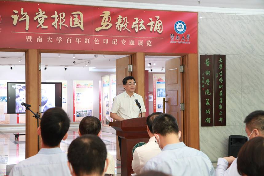 “发掘、整理红色校史资源,是学校落实习近平总书记关于红色文物和红色资源的重要指示批示精神的具体行动,也是推进校史+“四史”融入学校思政工作的生动实践。希望通过举办此次展览,让全校师生深刻认识和理解暨南人与党同心的红色血脉、为国担责的家国情怀和文传四海的历史使命,教育引导广大党员、师生传承红色基因,厚植爱国情怀,坚定理想信念,为实现中华民族伟大复兴的中国梦接续奋斗。”暨南大学校长宋献中说。