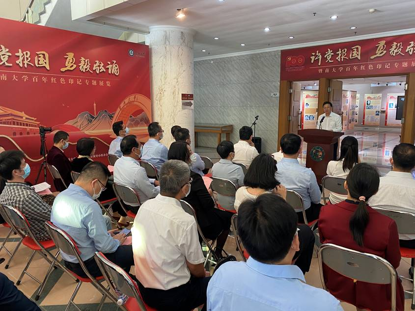 “许党报国 勇毅弦诵”暨南大学百年红色印记专题展览由暨南大学党史学习教育领导小组办公室主办,党委宣传部策划制作,从选题到布展,历时半载。展览内容共分为“与党同心”“为国担责”“文传四海”三大板块,以图文并茂和音视频结合的形式,通过300余张珍贵历史图片和相关资料,50余个主题的红色印记故事,多方面、多角度讲述了红色种子在暨南园的生根发芽,革命师生救亡图存,以及一代代暨南人开拓奋进在海外传承传播中华文化的动人故事。