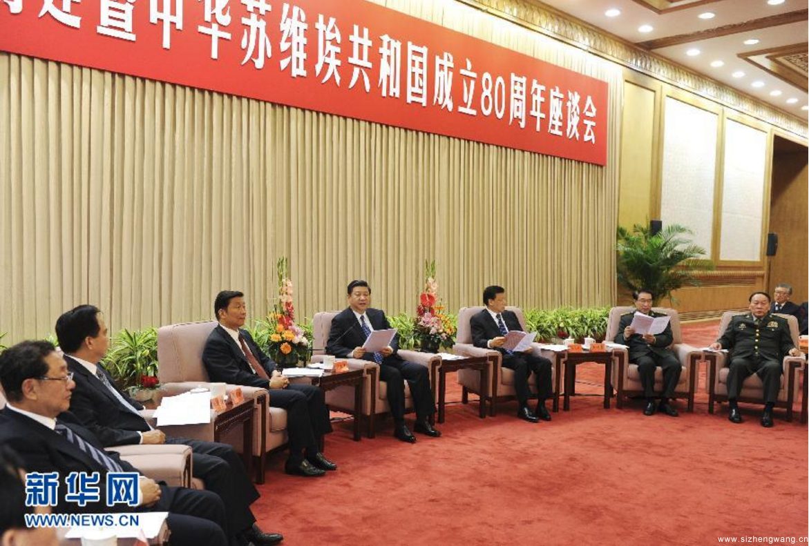 2011年11月4日,习近(jin)平在(zai)北京(jing)人民大会堂出席纪(ji)念中央革命根(gen)据地创建暨中华(hua)苏维埃共和国成立80周年座谈会并发表讲(jiang)话。 新华(hua)社(she)记(ji)者李学仁(ren)摄(she)