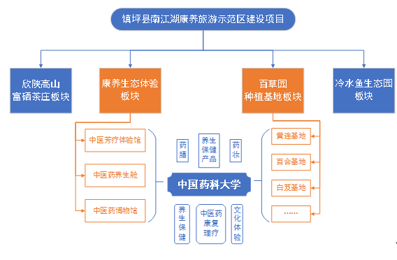 2.建设内容。项目主要包含康养生态体验板块(中医药博物馆、中医药养生舱、中医芳疗体验馆)、百草园种植基地板块(黄连示范种植基地、百合、芍药、白芨等中药材种植园)、欣陕高山富硒茶庄板块、冷水鱼生态园板块等四大板块内容,其核心区域为康养生态体验板块,着力打造集中医药康复理疗、养生保健、文化体验于一体的中医药健康旅游示范基地,配套中国药科大学研发的药膳、药妆、养生保健产品,达到吸引游客养生体验的目的。