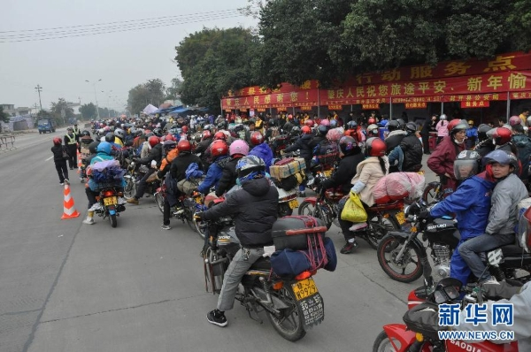 2012年1月11日,从珠三角返乡的“摩托大军”途径广东封开县一个春运服务点。图自新华网