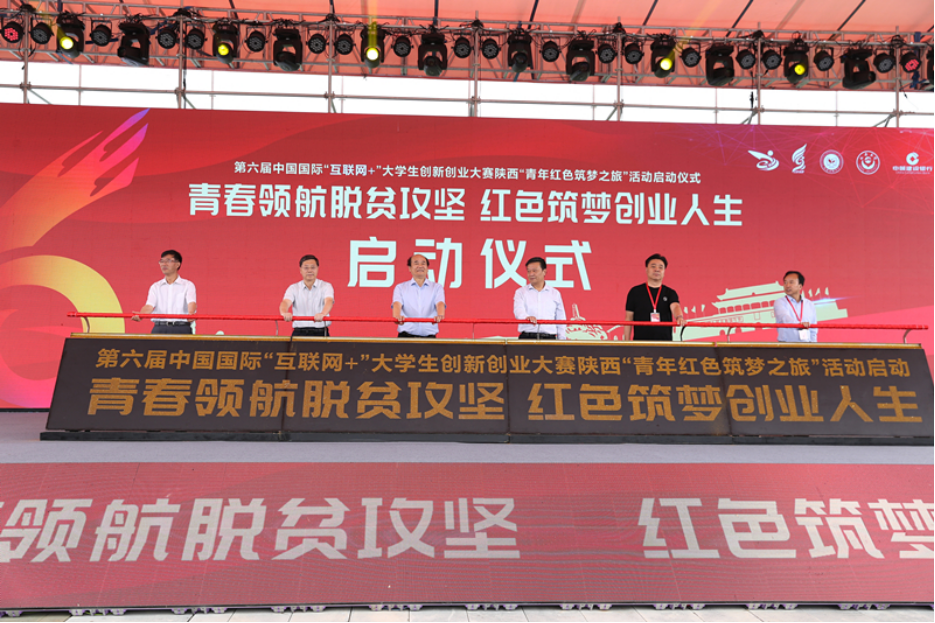 第六届中国国际“互联网(wang)+”大学生创(chuang)(chuang)新(xin)创(chuang)(chuang)业大赛陕(shan)西(xi)“青年红色(se)筑(zhu)梦之旅(lv)”活动(dong)(dong)参会领导和嘉宾共同(tong)推动(dong)(dong)流沙杆(gan)启动(dong)(dong)“青年红色(se)筑(zhu)梦之旅(lv)”活动(dong)(dong)