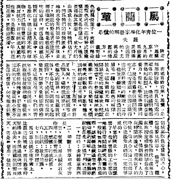 为(wei)了(le)冲破敌(di)人(ren)的(de)封锁,边(bian)区政府(fu)指派延(yan)安自(zi)然科学(xue)(xue)院(yuan)化学(xue)(xue)教员华寿俊(jun)(jun)到(dao)振华造(zao)纸厂(chang)(chang)担(dan)任(ren)(ren)工(gong)务科长,曾在德国(guo)学(xue)(xue)习(xi)化工(gong)的(de)留(liu)学(xue)(xue)生(sheng)刘咸一担(dan)任(ren)(ren)振华造(zao)纸厂(chang)(chang)厂(chang)(chang)长。他们尝试(shi)用高粱秆、麦秸、蒲草等(deng)多种(zhong)野生(sheng)植物做实验(yan),均(jun)以失败(bai)告终,只(zhi)有用稻草、杨(yang)木(mu)(mu)实验(yan)造(zao)纸获得了(le)成功,但由于(yu)边(bian)区稻草很少,杨(yang)木(mu)(mu)也(ye)不多,麻绳(sheng)、破布等(deng)就更(geng)微不足道了(le),造(zao)纸原(yuan)料(liao)成了(le)大问题。值得庆幸(xing)的(de)是,这位青年化学(xue)(xue)家(jia)华寿俊(jun)(jun)并(bing)没有放弃任(ren)(ren)何机会,最后在开(kai)荒(huang)生(sheng)产运动(dong)中(zhong)(zhong),无意中(zhong)(zhong)发现(xian)了(le)马(ma)兰(lan)草。在老百姓看来,马(ma)兰(lan)草是无用的(de)废物,而(er)且(qie)是开(kai)荒(huang)运动(dong)的(de)顽(wan)强的(de)敌(di)人(ren),农(nong)民的(de)锄头(tou)经(jing)常被密(mi)布的(de)马(ma)兰(lan)草所困扰(rao),比(bi)荆棘还(hai)要(yao)让人(ren)头(tou)疼,因此(ci)被当地(di)老百姓称为(wei)“扯倒驴(lv)”。华寿俊(jun)(jun)就是因为(wei)在开(kai)荒(huang)运动(dong)中(zhong)(zhong)吃了(le)它的(de)苦头(tou),也(ye)因此(ci)获得了(le)造(zao)纸原(yuan)料(liao)发明(ming)的(de)契机。他站在开(kai)遍蓝花(hua)的(de)马(ma)兰(lan)草坡上默默地(di)思索,发现(xian)这种(zhong)植物根须发达,纤维(wei)(wei)丰富(fu)而(er)且(qie)坚韧,从根到(dao)叶都是很长的(de)纤维(wei)(wei),断(duan)定(ding)它是顶好(hao)的(de)纤维(wei)(wei)工(gong)业原(yuan)料(liao),抱着(zhe)试(shi)一试(shi)的(de)心态割了(le)一捆,带回工(gong)厂(chang)(chang)做小型造(zao)纸试(shi)验(yan)。
