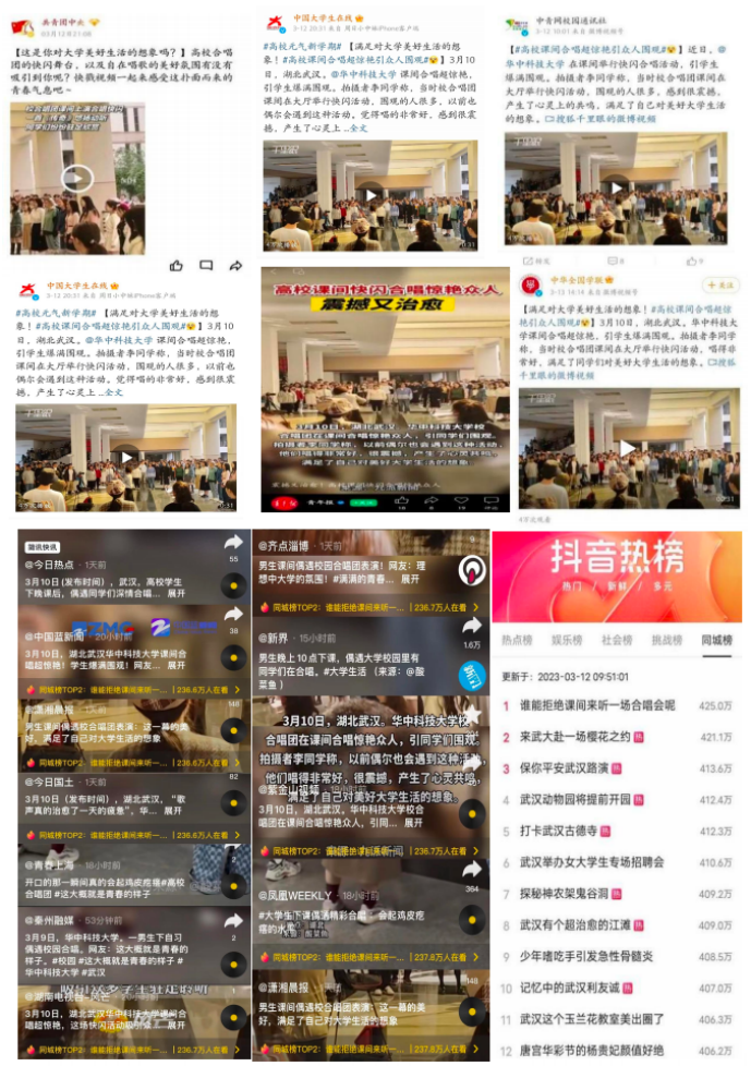 合唱团在教学楼开展红色音乐主题的艺术快闪,演唱《传奇》《追寻》,受共青团中央、中华全国学联官方平台关注,中国青年网转载,抖音平台同城热搜第1,浏览量破2000万