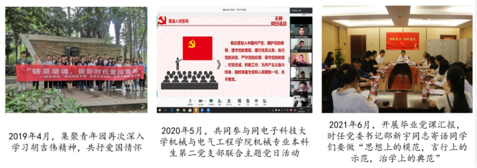 学院建立了“胡吉伟党支部—‘胡吉伟班’—‘胡吉伟班’团支部”的党建工作体系,胡吉伟党支部的党员在“胡吉伟班”和团支部担任主要学生干部,班级、团支部重要活动例如奖学金评选、班委竞选、主题班会、主题团日活动、特色团日活动都有胡吉伟党支部的把关和指导。除此之外,胡吉伟党支部还联合“胡吉伟班”开展思想教育类活动。2019年4月,胡吉伟党支部及第七届“胡吉伟班”的同学们集聚青年园再次深入学习胡吉伟精神,共抒爱国情怀。2020年5月,胡吉伟党支部联合第七届“胡吉伟班”同学共同参与同电子科技大学机械与电气工程学院机械专业本科生第二党支部联合主题党日活动。2021年6月,胡吉伟党支部和“胡吉伟班”的同学一起开展毕业党课汇报,时任党委书记邵新宇同志寄语与会同学“做思想上的模范,言行上的示范,治学上的典范”。2021年11月、2022年6月、2022年12月、2023年6月、2023年12月,校长尤政同志五次参加胡吉伟党支部组织生活,听取胡吉伟党支部党建带班团建设工作汇报,给予高度评价。