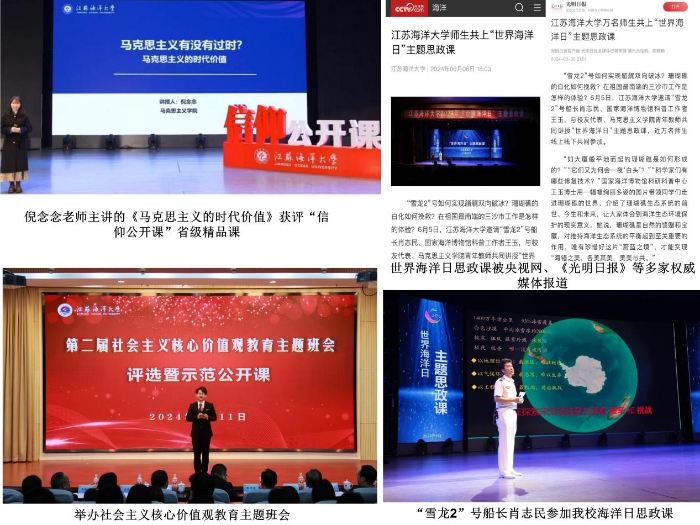 学(xue)(xue)(xue)(xue)校连续四(si)年修订出台(tai)《大(da)学(xue)(xue)(xue)(xue)生(sheng)社(she)会(hui)(hui)主(zhu)(zhu)(zhu)义核心价值观教育工作方案》,各职能部门协(xie)同推进、逐项落实。打造“党委书记与学(xue)(xue)(xue)(xue)生(sheng)面(mian)对(dui)面(mian)”“宁校有约(yue)”“信仰(yang)公(gong)开课(ke)(ke)(ke)(ke)”“社(she)会(hui)(hui)主(zhu)(zhu)(zhu)义核心价值观主(zhu)(zhu)(zhu)题示(shi)范班会(hui)(hui)”等(deng)(deng)思(si)(si)政品(pin)牌。依托青年讲(jiang)师(shi)团、青马宣(xuan)讲(jiang)团开展小型化、分众化宣(xuan)讲(jiang)活(huo)(huo)动(dong),获评(ping)(ping)“信仰(yang)公(gong)开课(ke)(ke)(ke)(ke)”省级精品(pin)课(ke)(ke)(ke)(ke)1项。组织(zhi)开展撷华(hua)书会(hui)(hui)、“挑战杯(bei)”项目路演答辩、草坪音乐(le)会(hui)(hui)等(deng)(deng)各类校级活(huo)(huo)动(dong)百余场次,学(xue)(xue)(xue)(xue)生(sheng)社(she)区(qu)创(chuang)新团队斩(zhan)获“挑战杯(bei)”主(zhu)(zhu)(zhu)体赛事全(quan)国银奖(jiang)(jiang)、“揭榜挂帅(shuai)”专项赛全(quan)国二等(deng)(deng)奖(jiang)(jiang)。持续加强蓝色思(si)(si)政品(pin)牌建设,举(ju)办海洋嘉年华(hua)、世界(jie)海洋日思(si)(si)政课(ke)(ke)(ke)(ke)等(deng)(deng)活(huo)(huo)动(dong),活(huo)(huo)动(dong)被央视网(wang)、《光明(ming)日报》等(deng)(deng)权威(wei)媒体报道。积极探索“机制、队伍、平台(tai)、作品(pin)、理(li)论研究(jiu)”五维融合的(de)立体化网(wang)络育人工作体系(xi),斩(zhan)获全(quan)国高校大(da)学(xue)(xue)(xue)(xue)生(sheng)讲(jiang)思(si)(si)政课(ke)(ke)(ke)(ke)公(gong)开课(ke)(ke)(ke)(ke)展示(shi)活(huo)(huo)动(dong)一(yi)等(deng)(deng)奖(jiang)(jiang)、微电影展示(shi)活(huo)(huo)动(dong)三等(deng)(deng)奖(jiang)(jiang)、省大(da)学(xue)(xue)(xue)(xue)生(sheng)网(wang)络文(wen)化节奖(jiang)(jiang)项5项,获评(ping)(ping)省年度“优秀易班共建案例(li)”、易班优质(zhi)公(gong)开课(ke)(ke)(ke)(ke)一(yi)等(deng)(deng)奖(jiang)(jiang)、二等(deng)(deng)奖(jiang)(jiang)各1项。