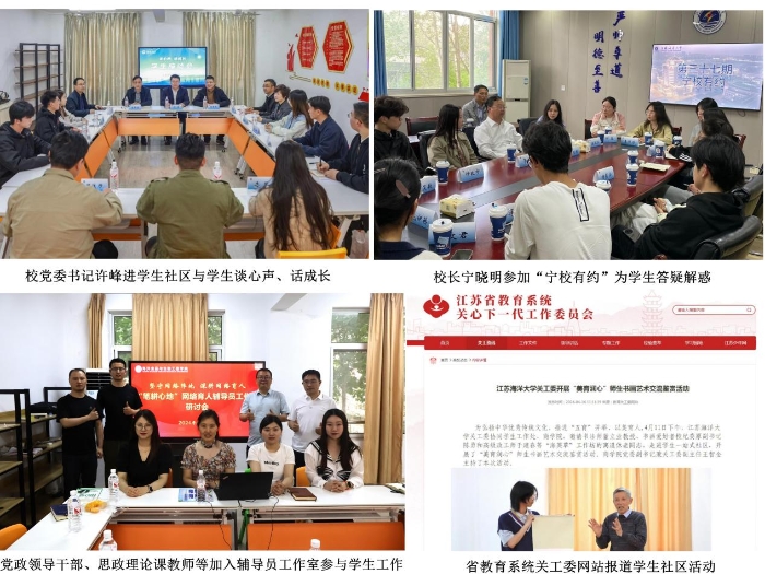 领导(dao)(dao)干(gan)部带头进学生(sheng)(sheng)(sheng)(sheng)(sheng)(sheng)(sheng)社区,校(xiao)(xiao)党(dang)委书记(ji)、校(xiao)(xiao)长定期进学生(sheng)(sheng)(sheng)(sheng)(sheng)(sheng)(sheng)社区与(yu)学生(sheng)(sheng)(sheng)(sheng)(sheng)(sheng)(sheng)谈心(xin)声、话成长,2024年领导(dao)(dao)班子成员通过座谈会、思政(zheng)课等(deng)形式与(yu)学生(sheng)(sheng)(sheng)(sheng)(sheng)(sheng)(sheng)面(mian)对面(mian)交流30余(yu)场次。专(zhuan)职辅导(dao)(dao)员入驻学生(sheng)(sheng)(sheng)(sheng)(sheng)(sheng)(sheng)公寓,与(yu)学生(sheng)(sheng)(sheng)(sheng)(sheng)(sheng)(sheng)同吃同住(zhu)同生(sheng)(sheng)(sheng)(sheng)(sheng)(sheng)(sheng)活。选聘(pin)学校(xiao)(xiao)党(dang)政(zheng)干(gan)部、离退休教(jiao)师、思政(zheng)理(li)论(lun)课教(jiao)师、优(you)秀研究生(sheng)(sheng)(sheng)(sheng)(sheng)(sheng)(sheng)等(deng)担任学生(sheng)(sheng)(sheng)(sheng)(sheng)(sheng)(sheng)社区兼职辅导(dao)(dao)员、指导(dao)(dao)老师,进驻学生(sheng)(sheng)(sheng)(sheng)(sheng)(sheng)(sheng)社区广泛(fan)开展学生(sheng)(sheng)(sheng)(sheng)(sheng)(sheng)(sheng)社区心(xin)理(li)健康(kang)教(jiao)育(yu)主(zhu)题活动(dong)、团体辅导(dao)(dao)、心(xin)理(li)健康(kang)知(zhi)识普(pu)及等(deng)活动(dong)。邀请(qing)道(dao)德模范(fan)、优(you)秀校(xiao)(xiao)友、“五老”等(deng)校(xiao)(xiao)内(nei)外(wai)专(zhuan)业力(li)量进入社区,2024年已开展德育(yu)、美(mei)育(yu)等(deng)各(ge)类主(zhu)题活动(dong)240余(yu)场次,“海英草”工作(zuo)坊入驻学生(sheng)(sheng)(sheng)(sheng)(sheng)(sheng)(sheng)社区开展“美(mei)育(yu)润(run)心(xin)”教(jiao)育(yu)活动(dong)被省(sheng)教(jiao)育(yu)系(xi)统关(guan)工委网站报道(dao)。
