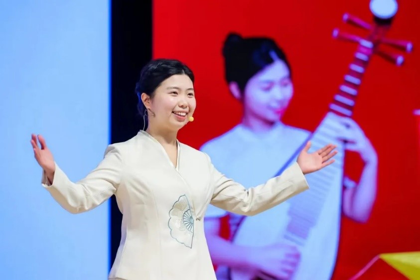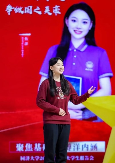 她说:“作为外语人的我,用三语讲解百年校史,用四弦弹奏千年风韵,做到了始于语言,不止于语言。希望在座的各位也能始于自己的专业,不止于自己的专业。”