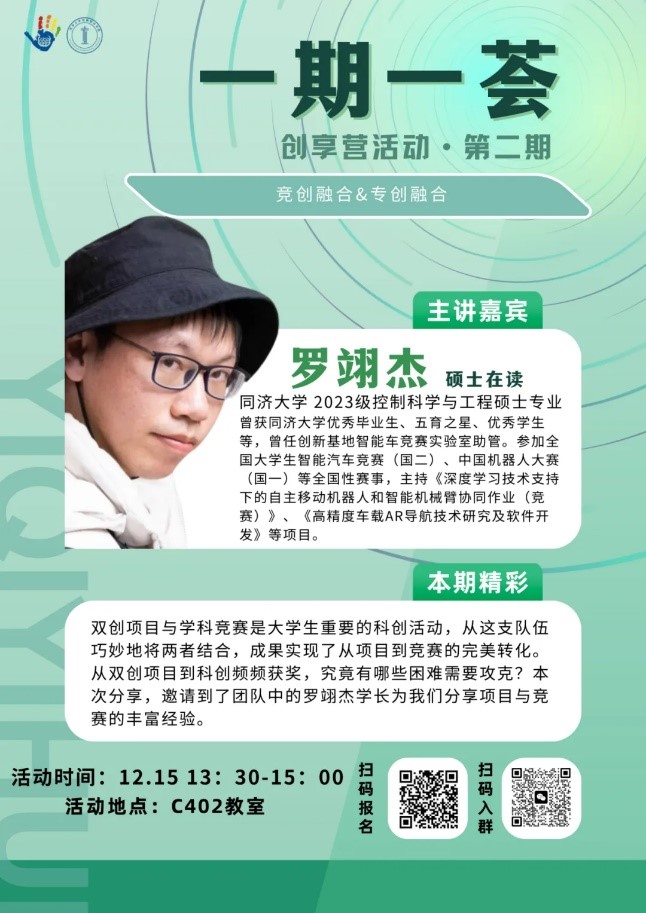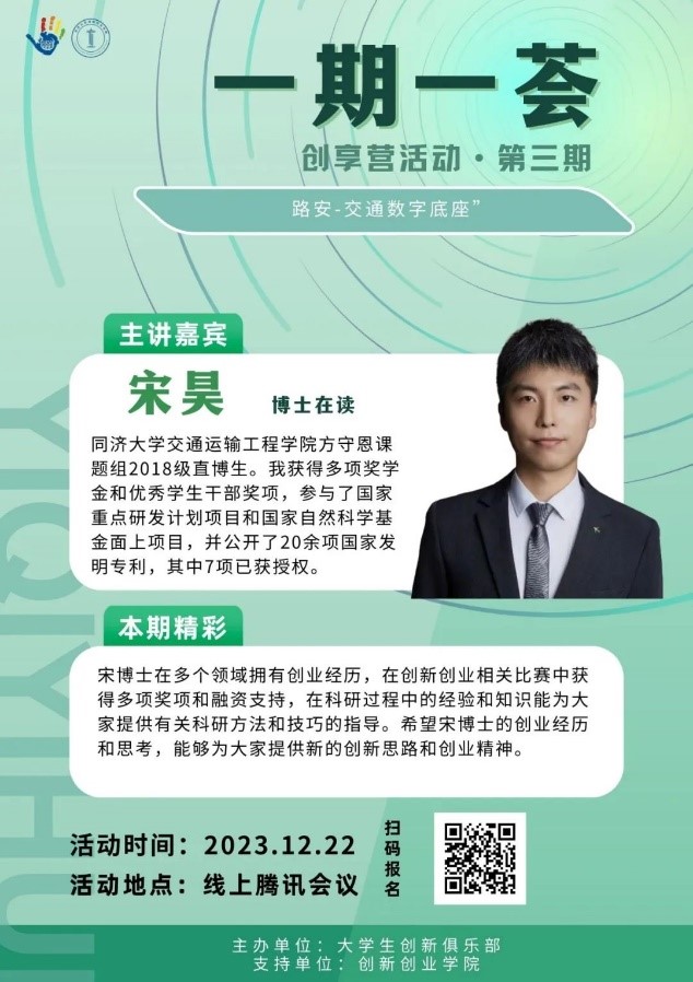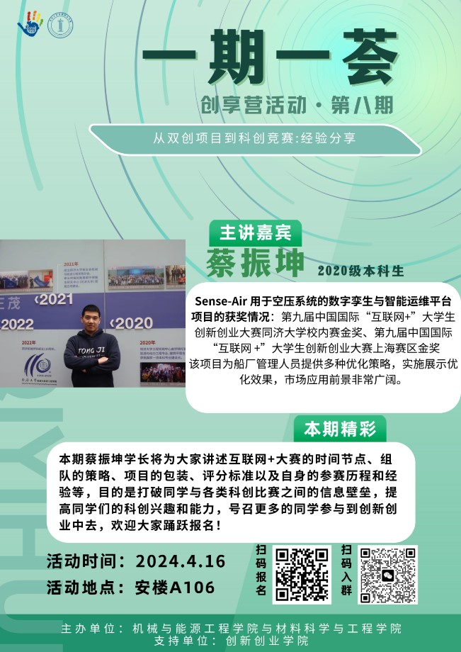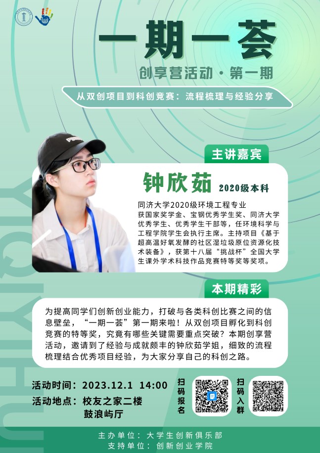 总书记指出:“青年学生富有想像力和创造力,是创新创业的有生力量。”为了激发同学们的创新创业激情,同济大学大学生创新俱乐部特别设计了“一期一荟”创享营活动。在这个活动中,我们邀请了在各类创新创业比赛中崭露头角的双创项目团队和优秀创业项目团队与大家进行分享,他们不仅在各类创新创业比赛中获得奖项,更是在实践中探索、奋斗、取得成功,拥有双创第一线的宝贵经验。