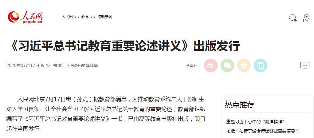 人民网:《习近平总书记教育重要论述讲义》出版发行