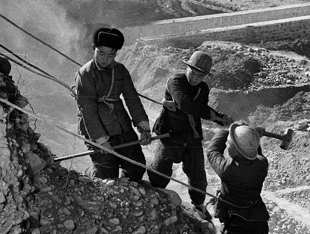 王师存和民工们一起日夜艰苦奋战,硬是一锤锤打,一铲...